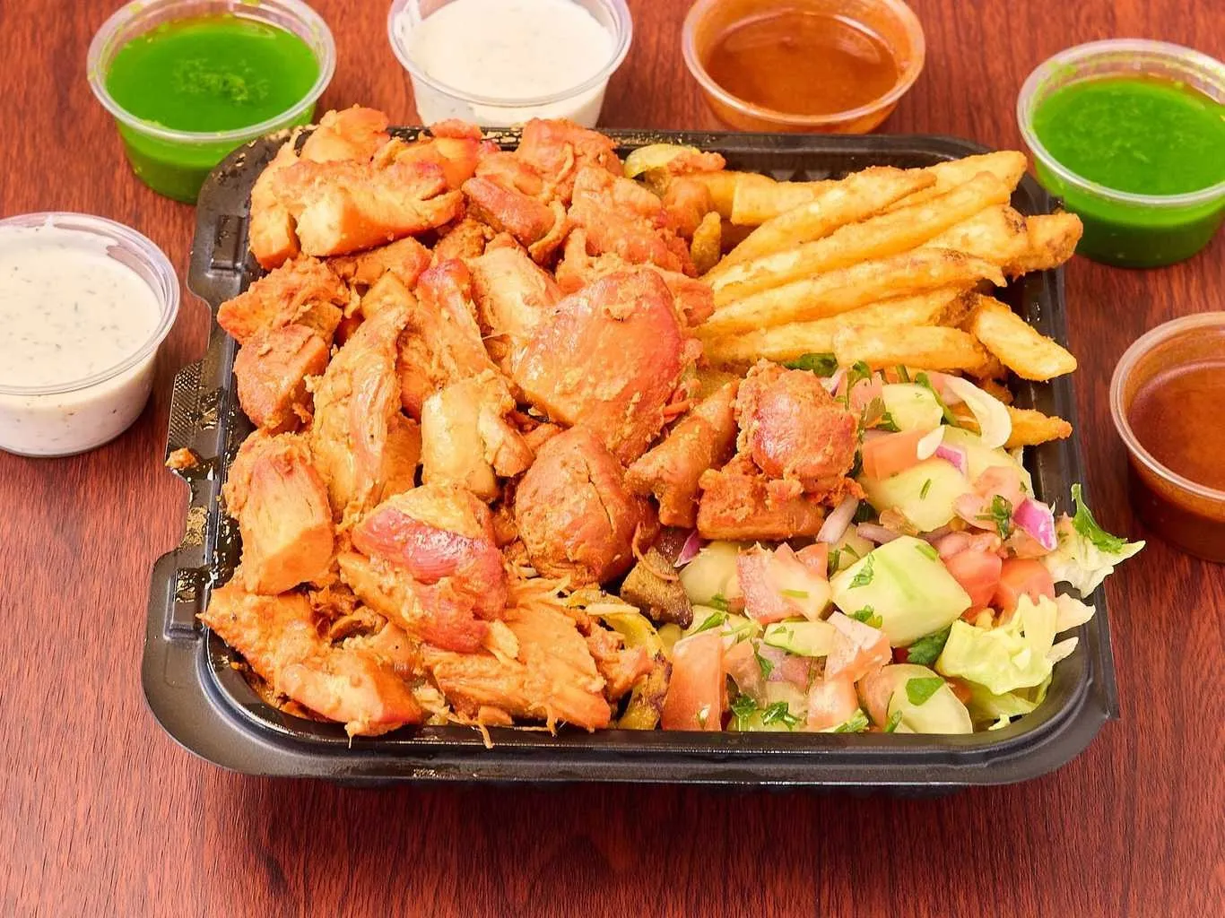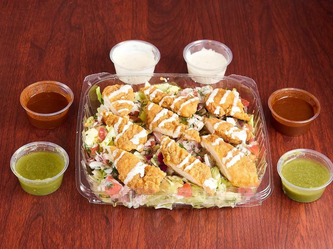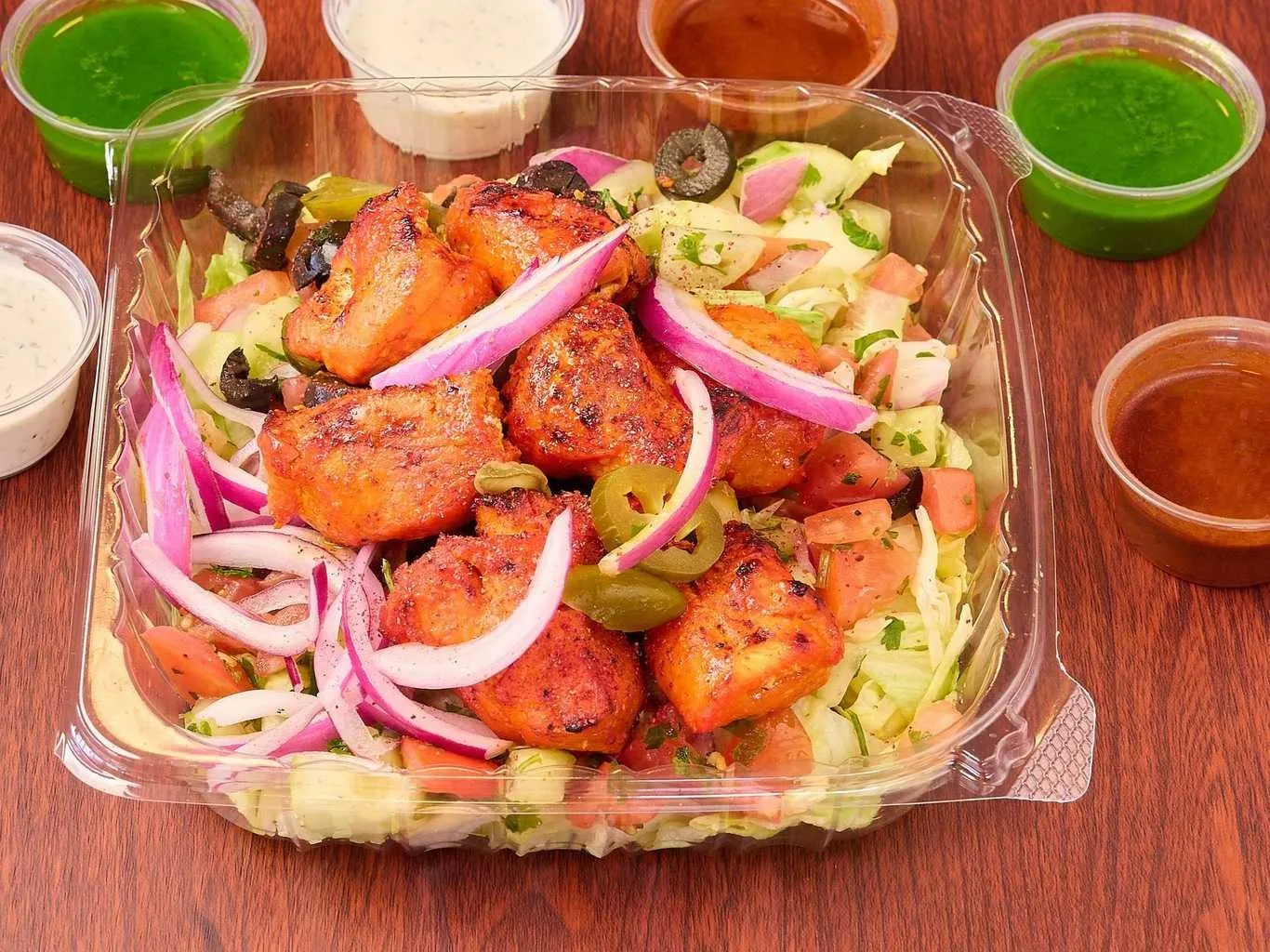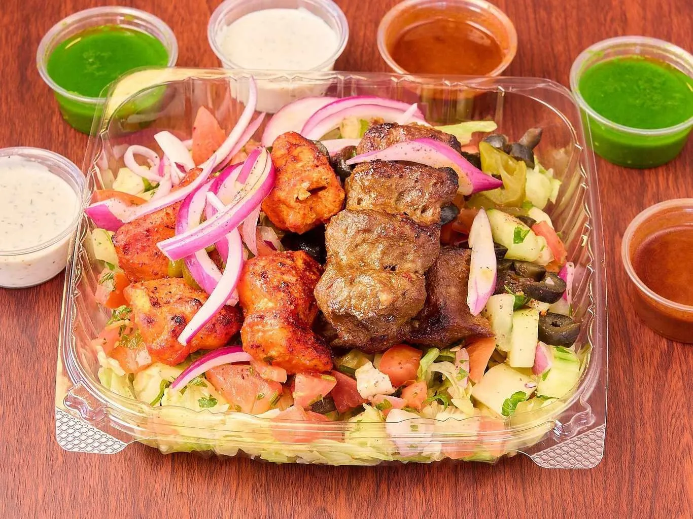 Tender Chicken And Lamb Pieces On A Bed Of Fresh Greens, Topped With Assorted Dressings.