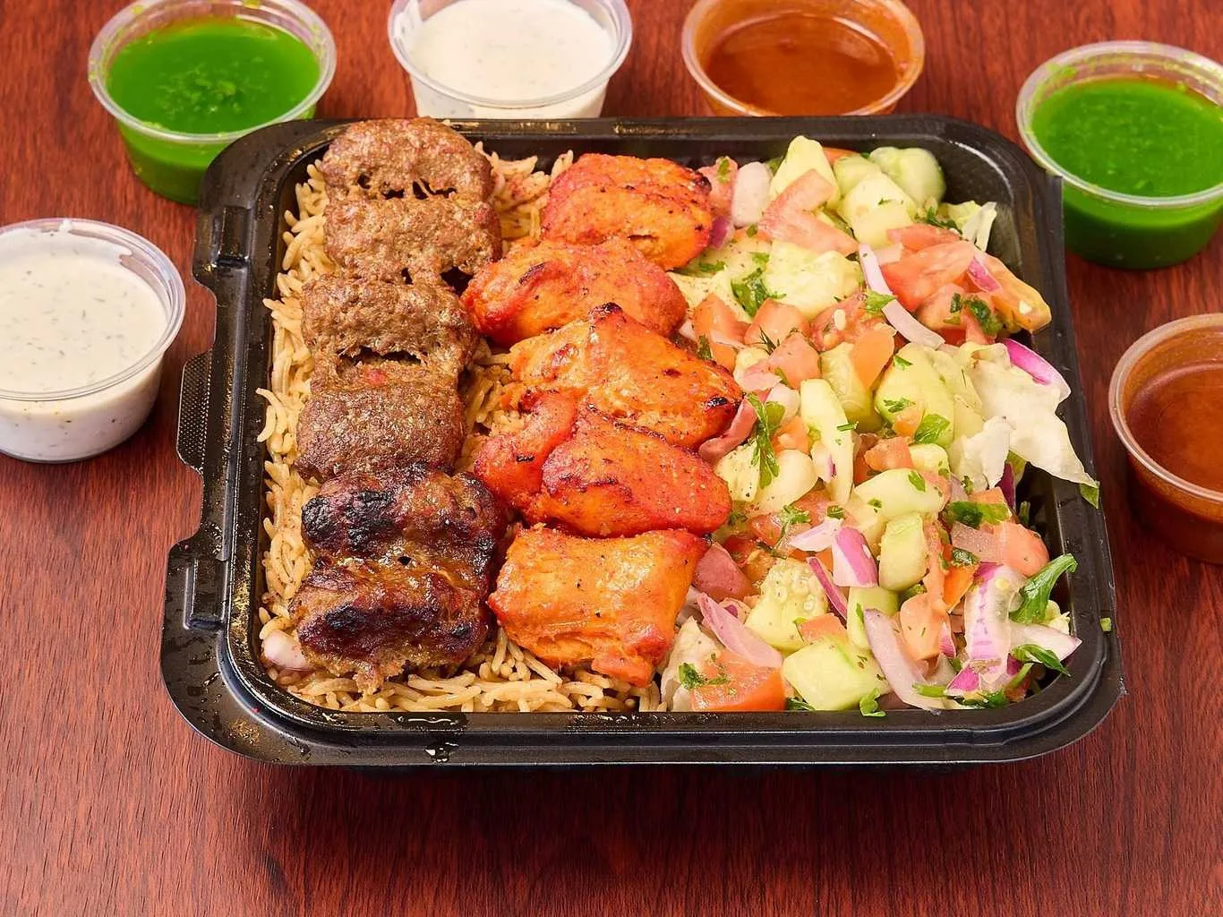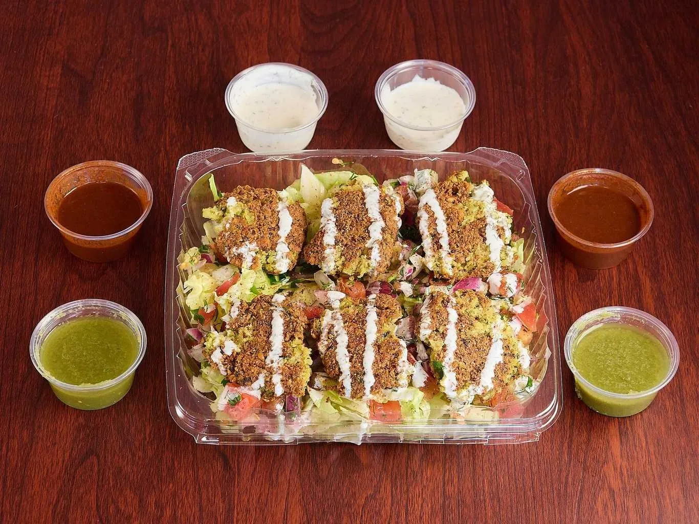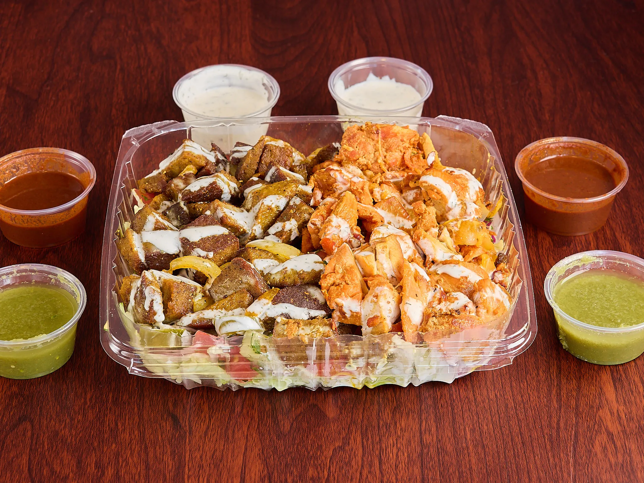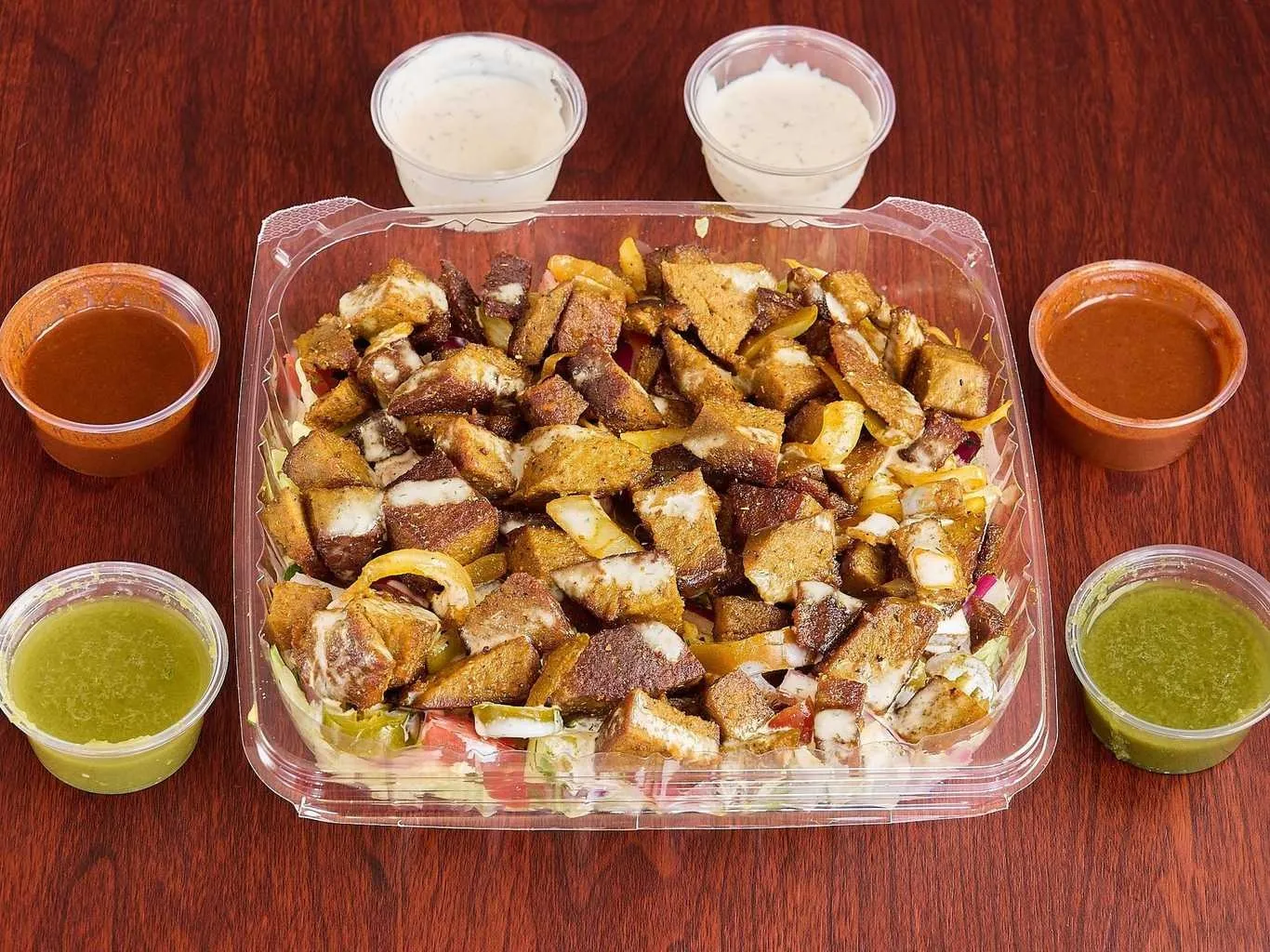 Tender Chicken And Lamb Pieces On A Bed Of Fresh Greens, Topped With Assorted Dressings.