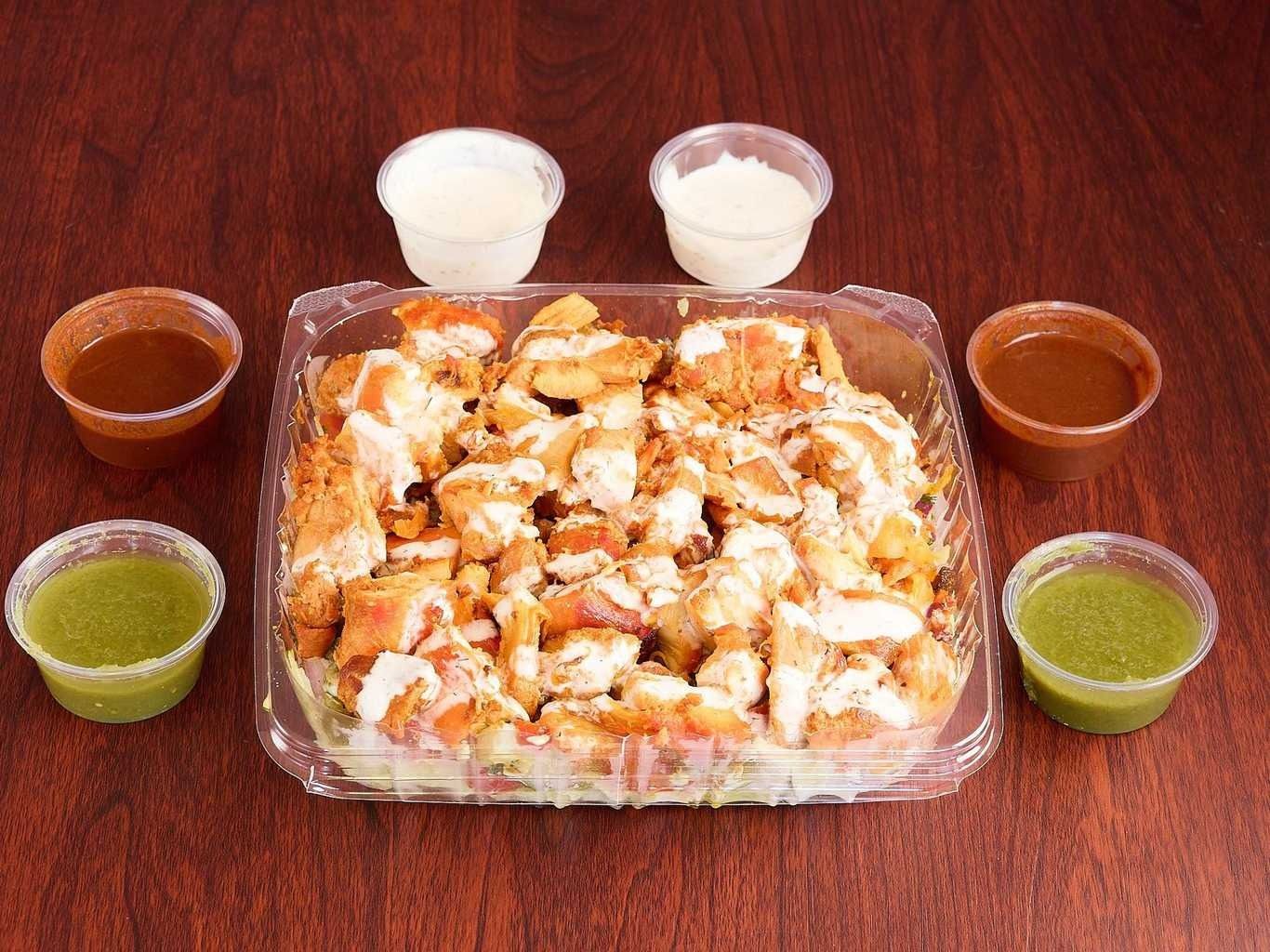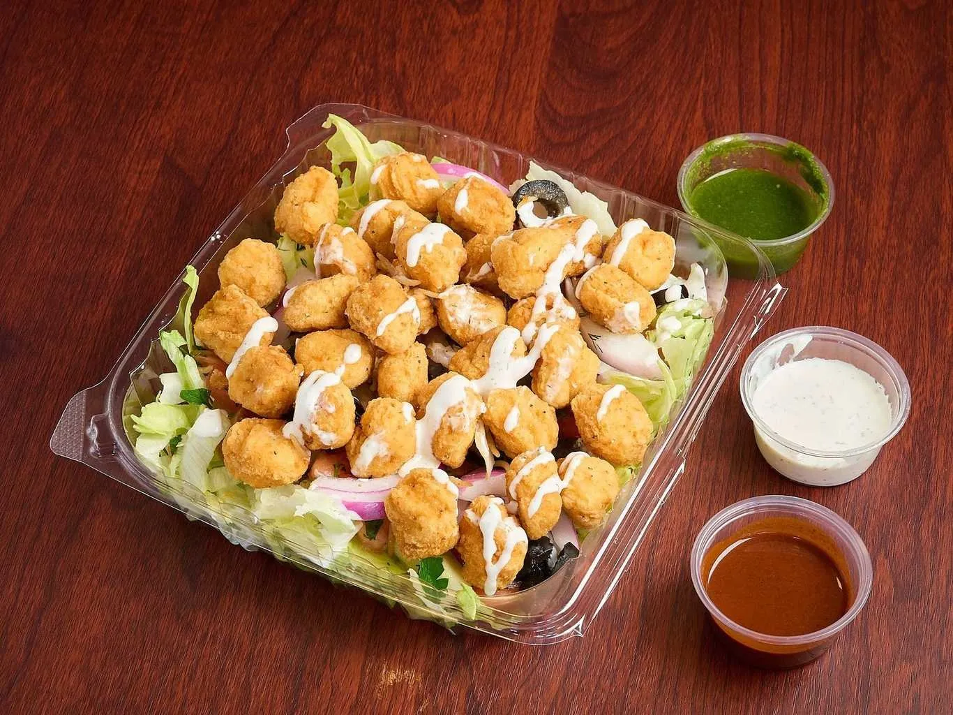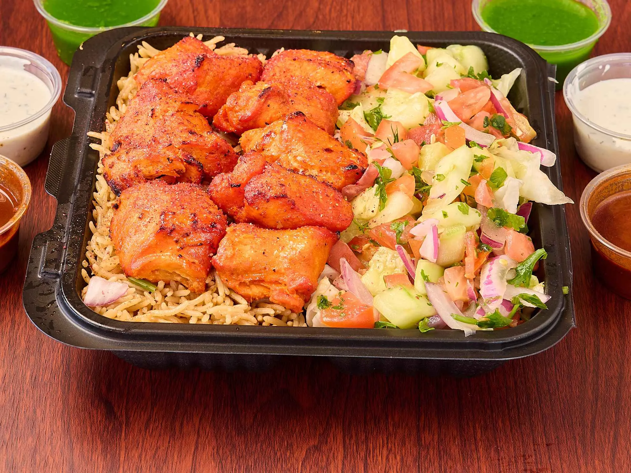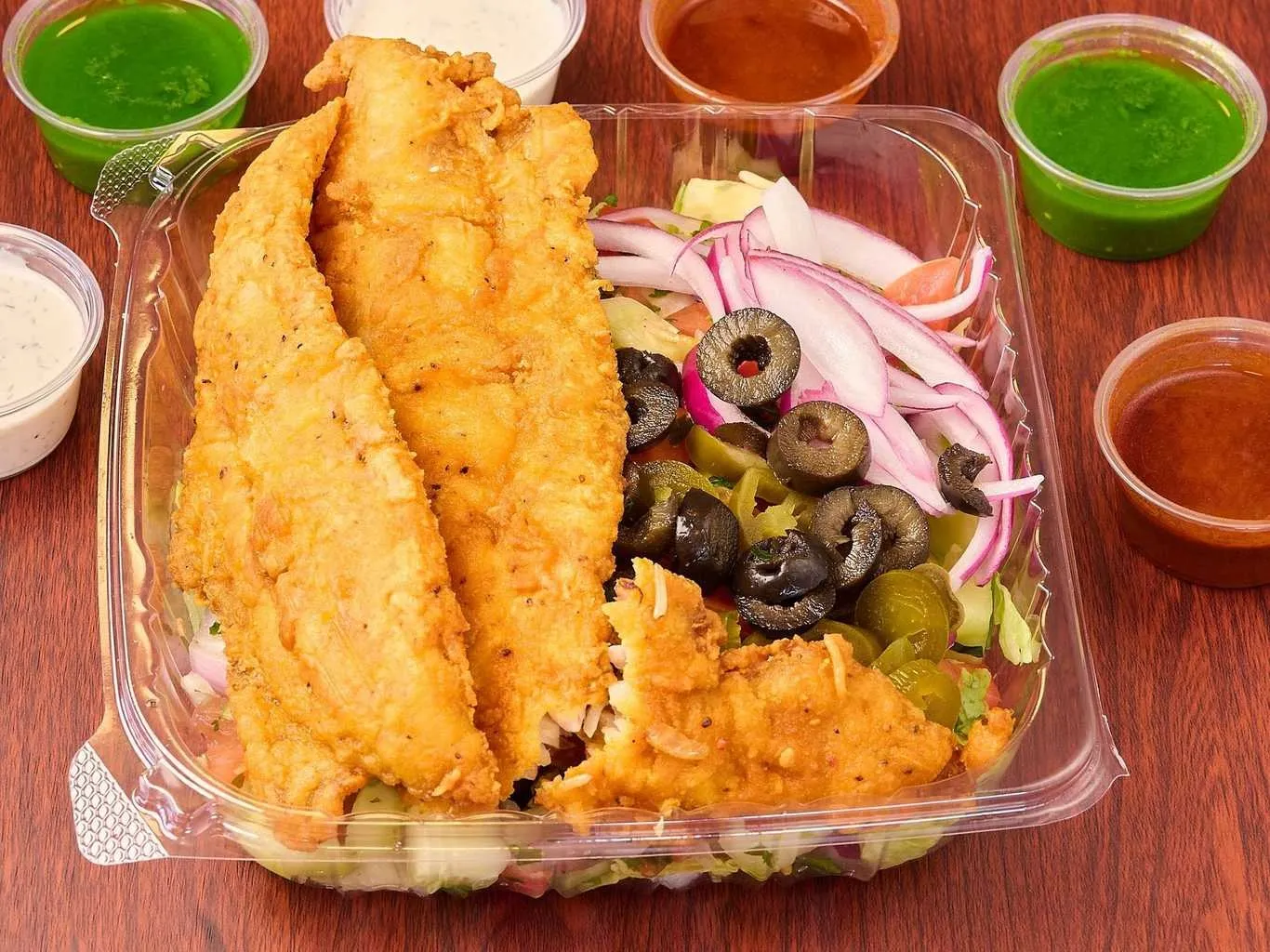 Tender Chicken And Lamb Pieces On A Bed Of Fresh Greens, Topped With Assorted Dressings.