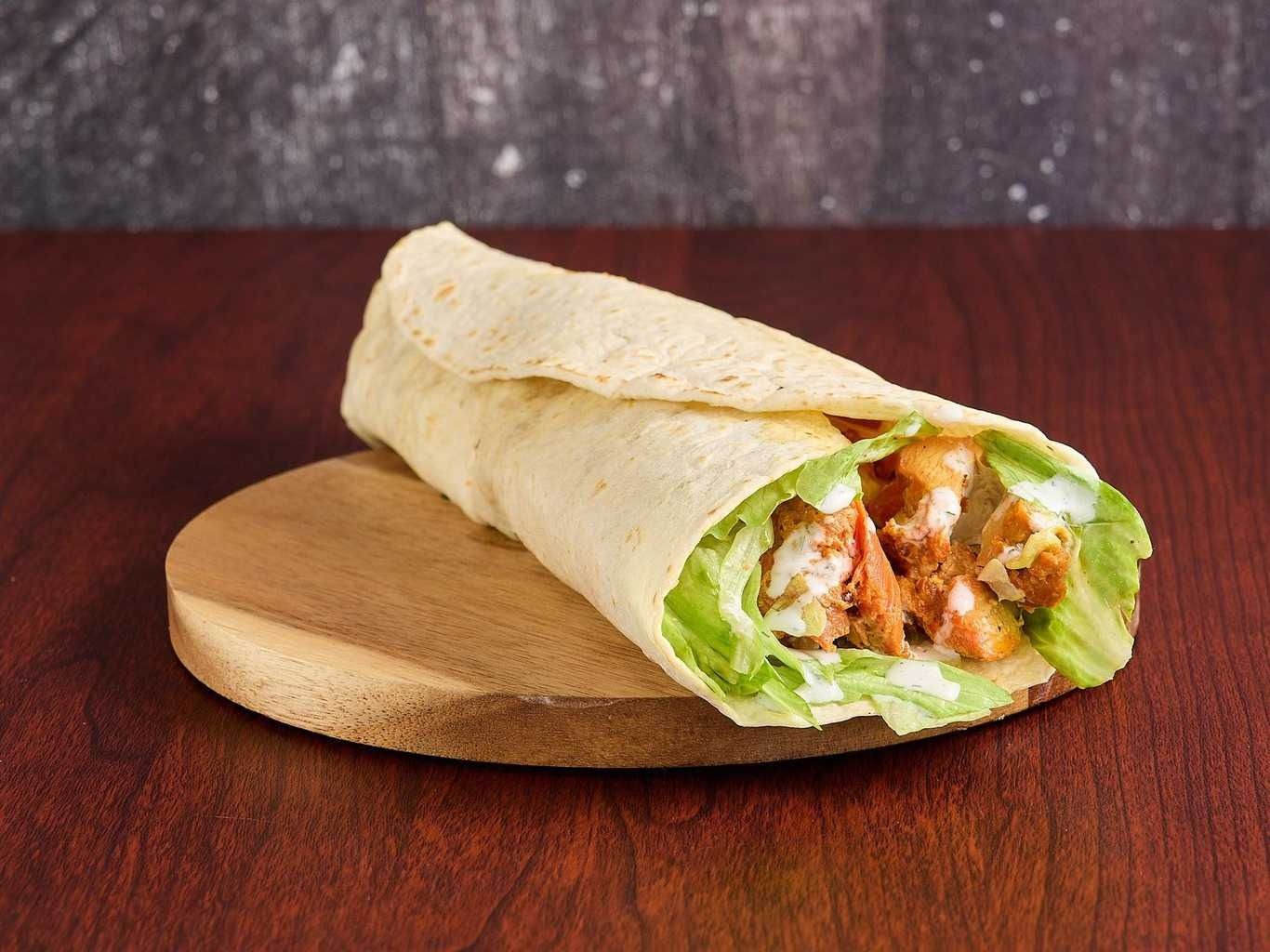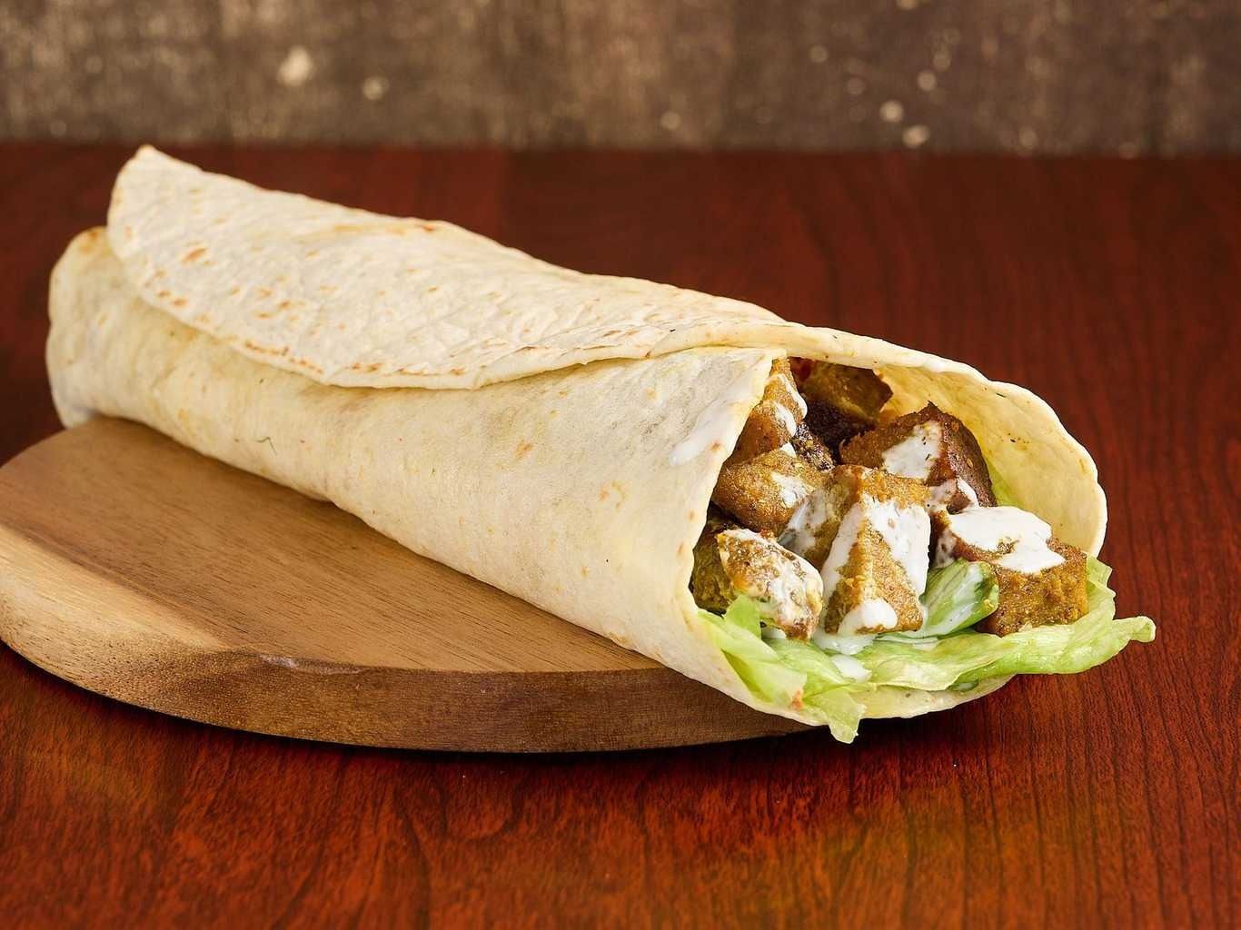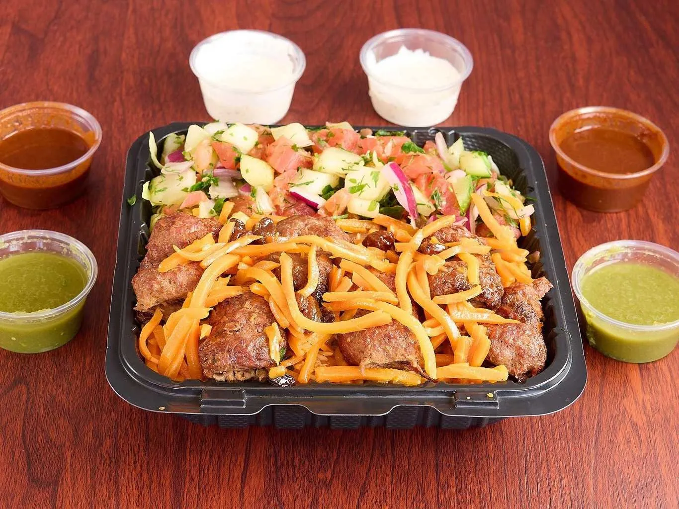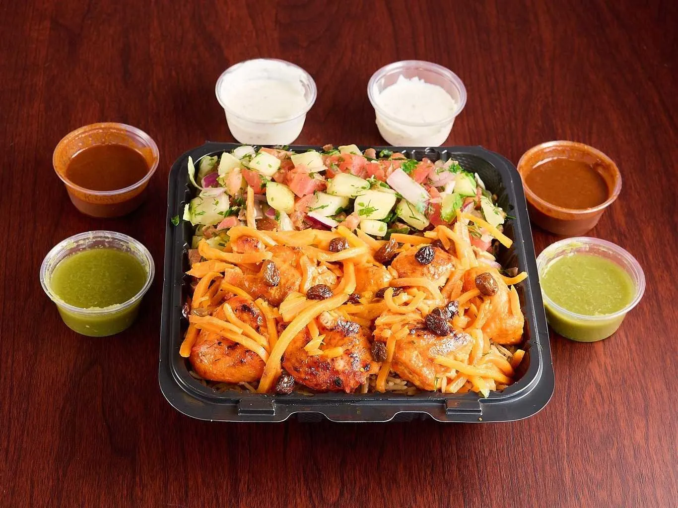 Tender Chicken And Lamb Pieces On A Bed Of Fresh Greens, Topped With Assorted Dressings.
