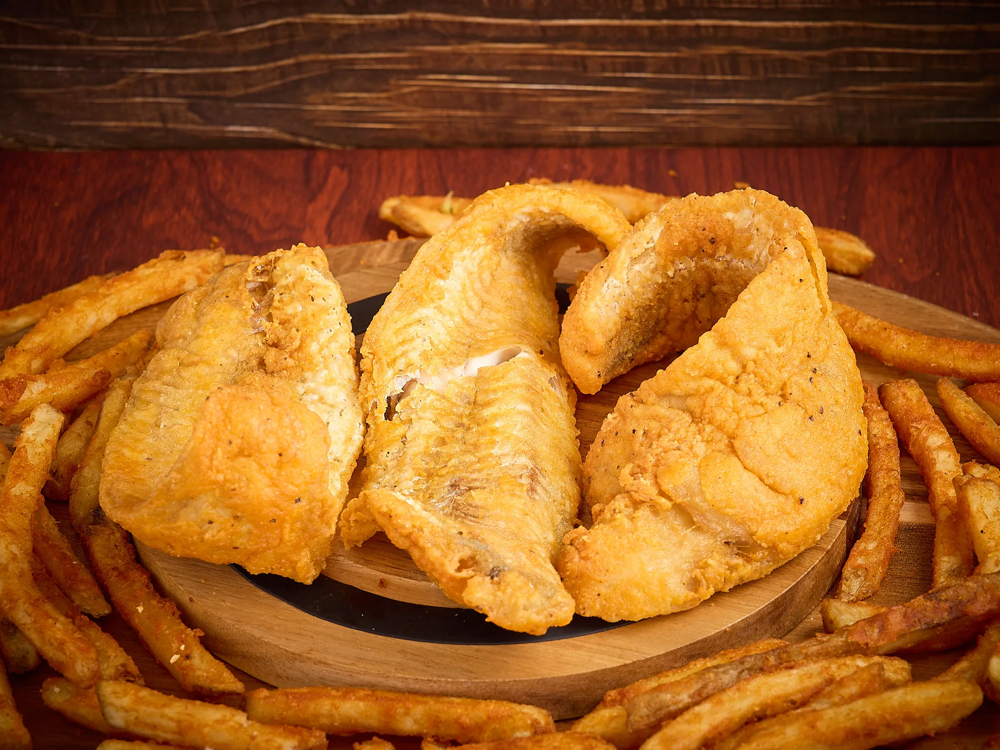 Crispy, Golden-Fried Whiting Fish Fillets Paired With Seasoned Fries.