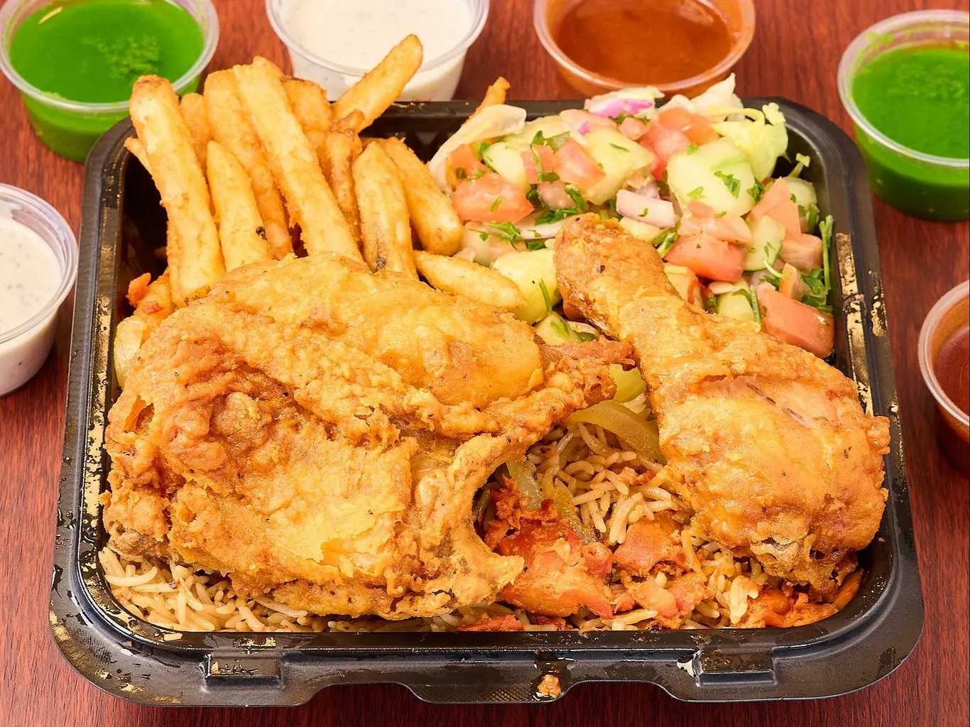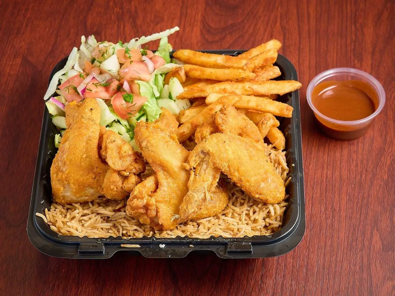 6 Wings With Fries. Choice Of Bbq, Buffalo, Or Hot Wings. Halal.