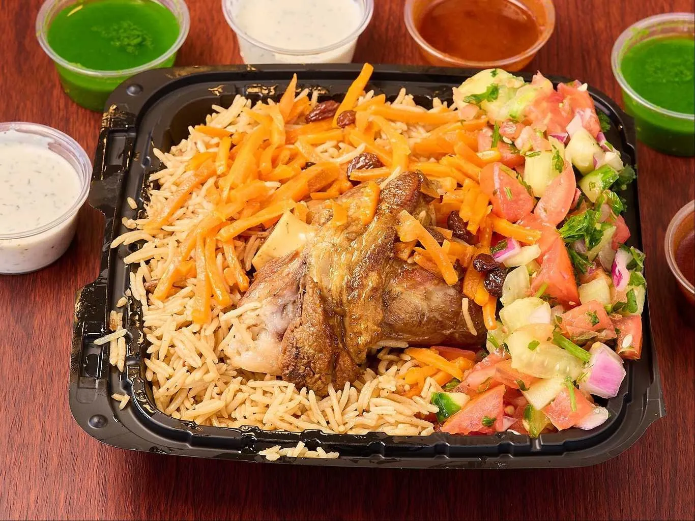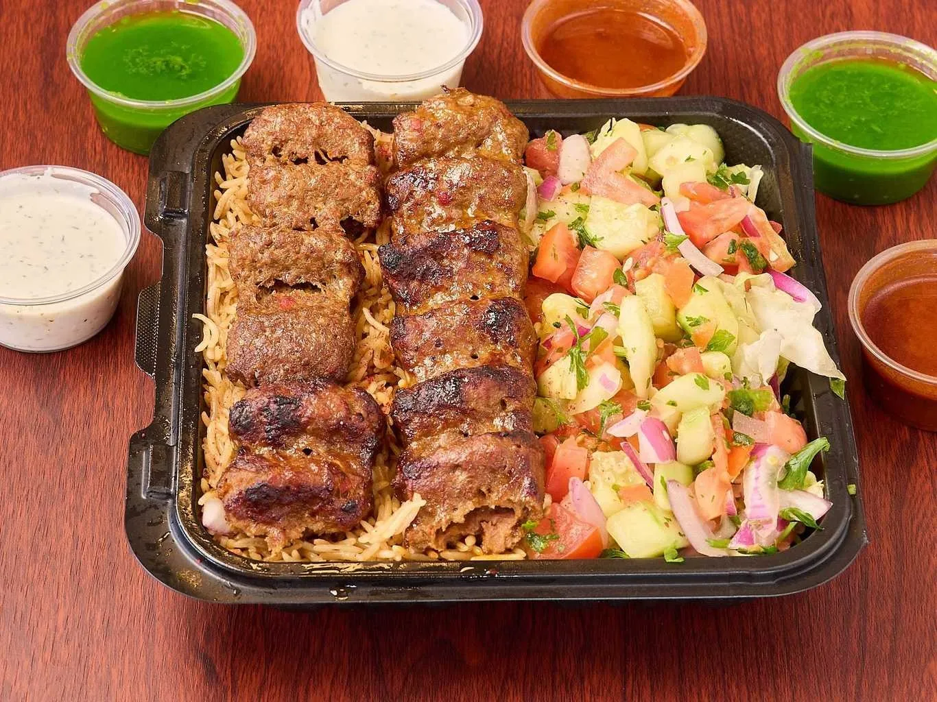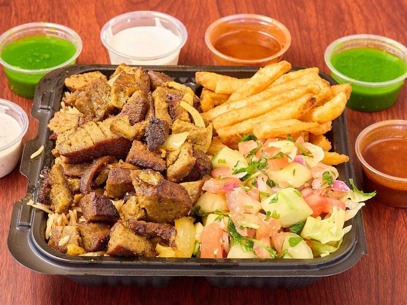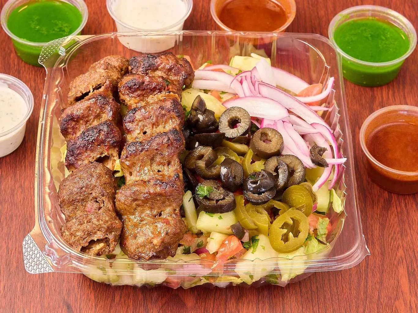 Tender Lamb Gyro Pieces Atop A Bed Of Fresh Lettuce, Tomatoes, And Onions, Served With A Selection Of Sauces.